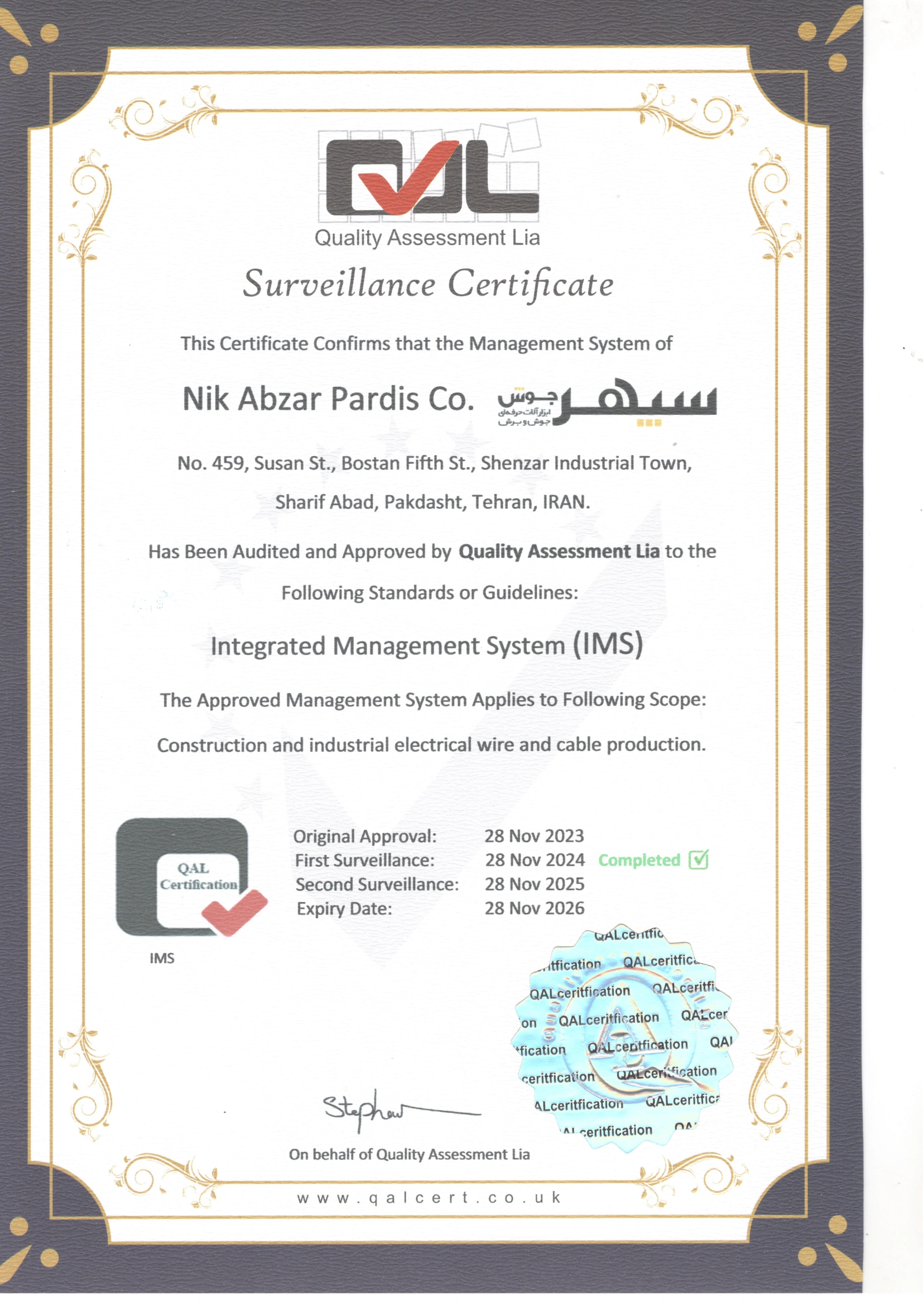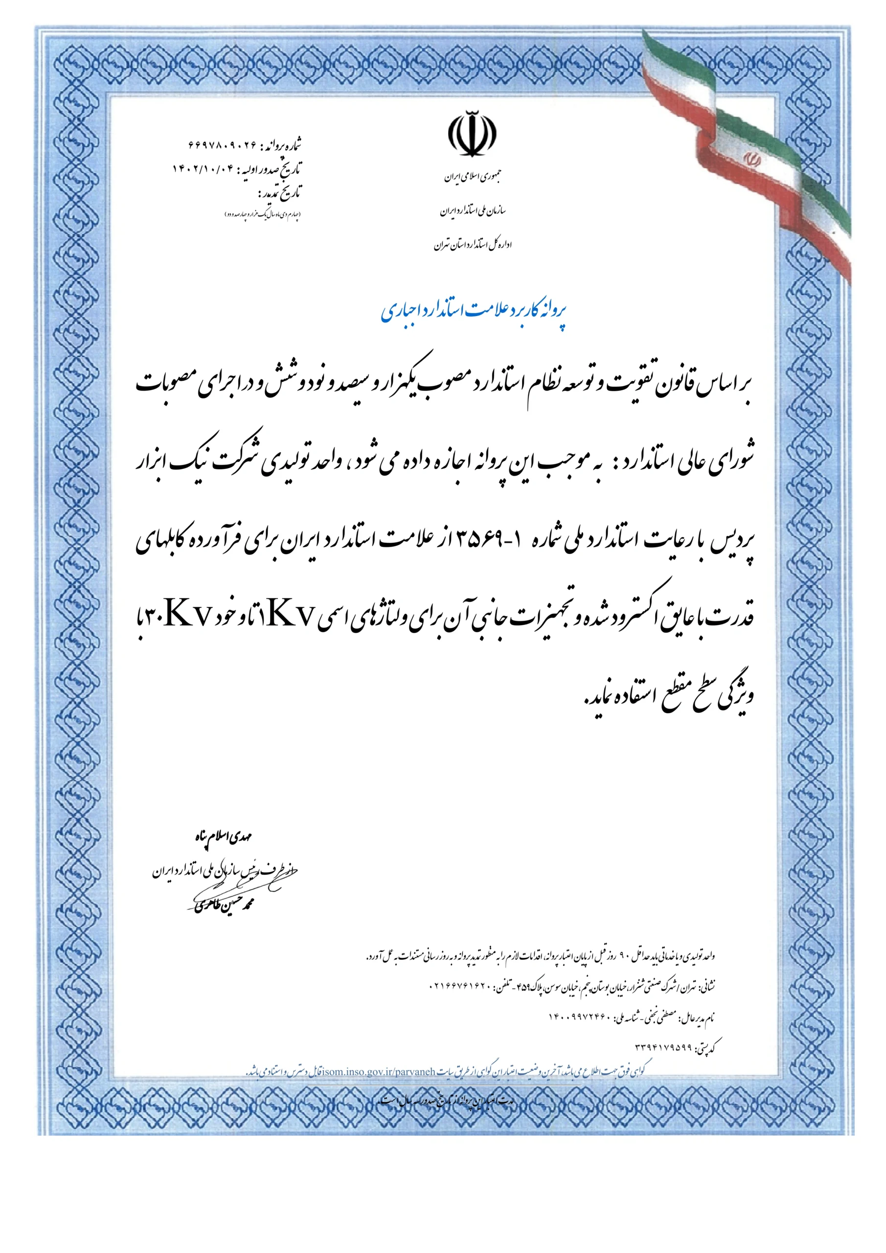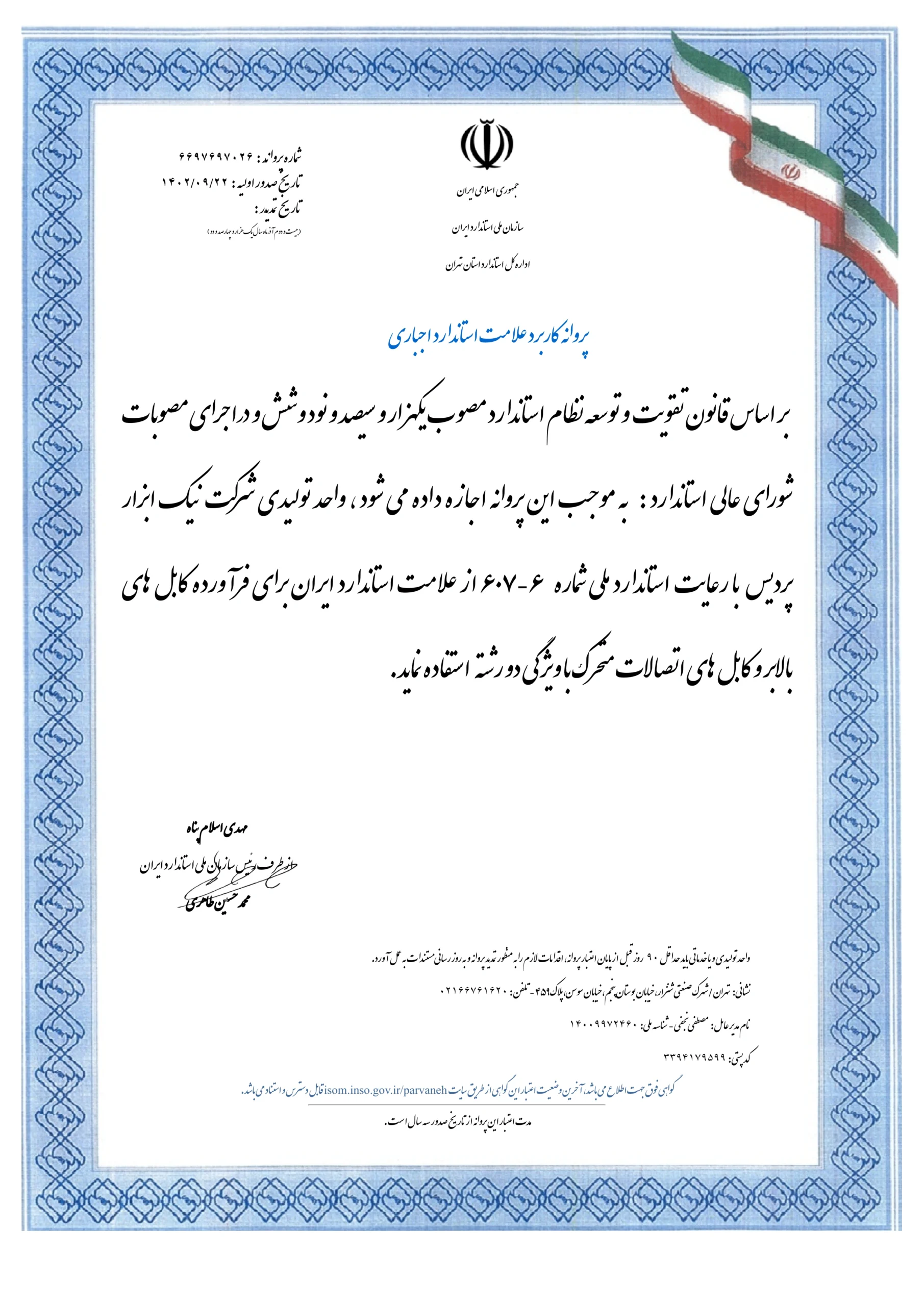 در این صفحه تصاویر تعدادی از گواهینامهها و لوحهای تقدیری که طی این سالها دریافت شده است، تقدیم نگاهتان میگردد. استاندارد کابل بالابر استاندارد کابل قدرت استاندارد کابل مفتول استاندارد سیم ها استاندارد کابل افشان ISO 10668 ISO 14001 ISO 45001 ISO IMS ISO 9001