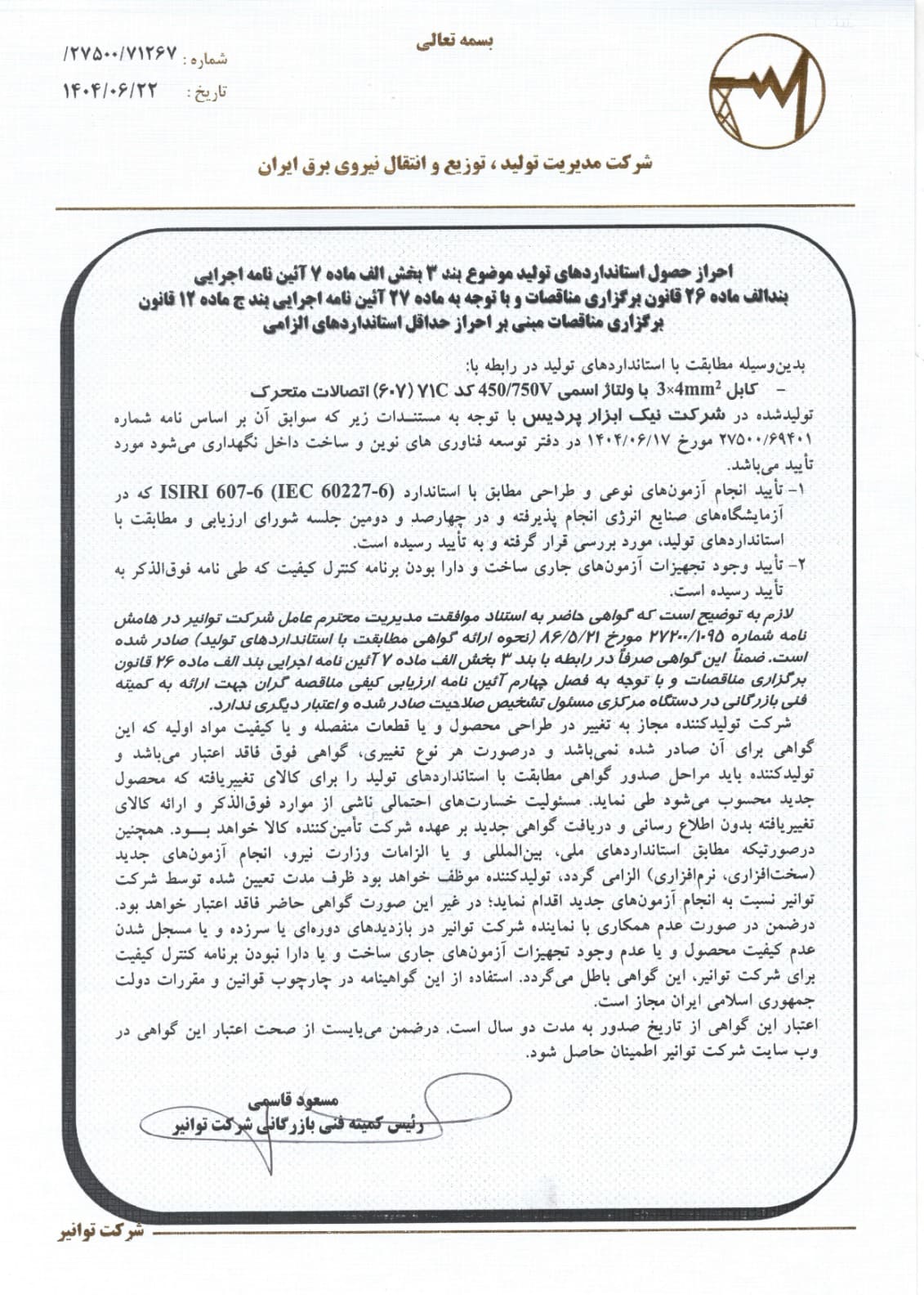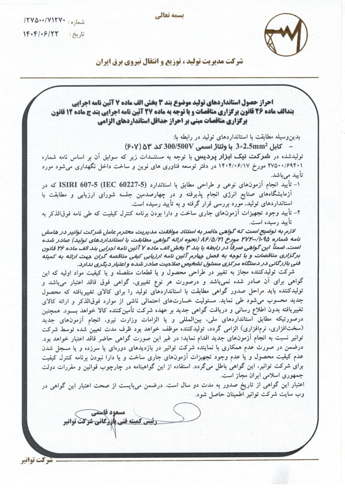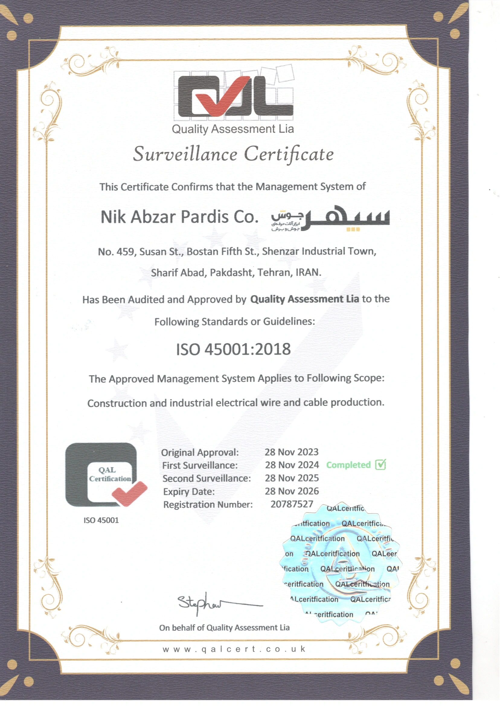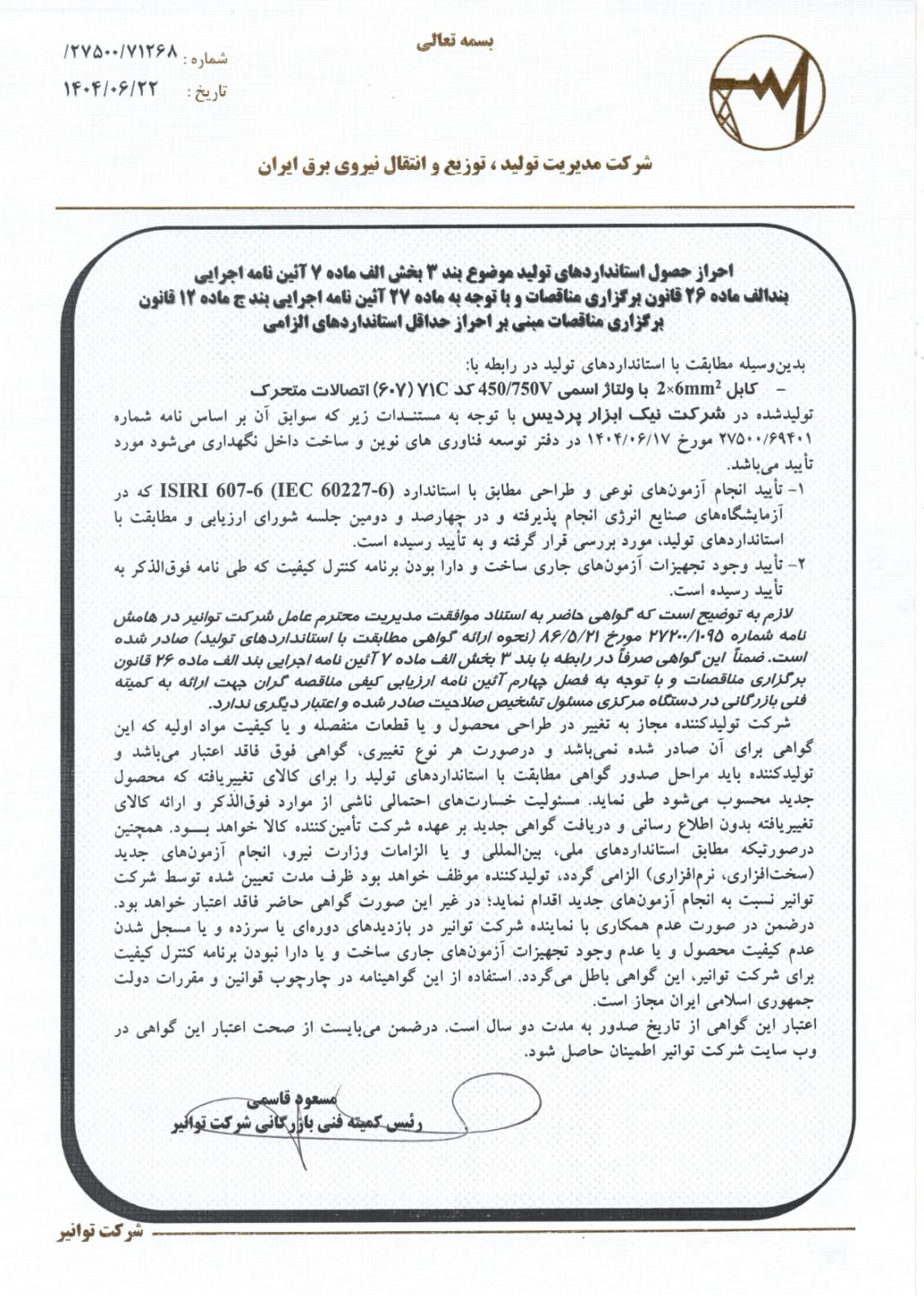 در این صفحه تصاویر تعدادی از گواهینامهها و لوحهای تقدیری که طی این سالها دریافت شده است، تقدیم نگاهتان میگردد. استاندارد کابل بالابر استاندارد کابل قدرت استاندارد کابل مفتول استاندارد سیم ها استاندارد کابل افشان ISO 10668 ISO 14001 ISO 45001 ISO IMS ISO 9001
